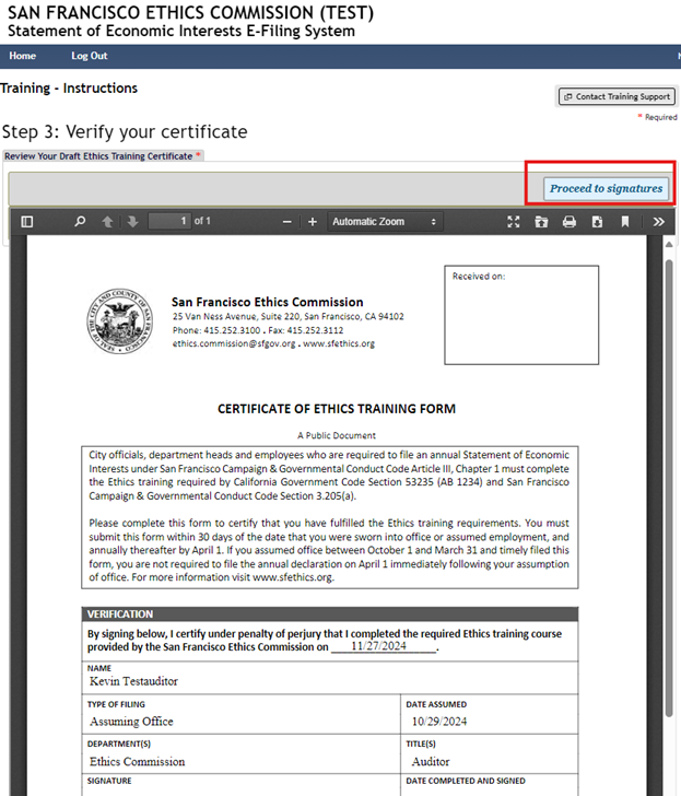 Once the certificate is read and verified as accurate, click the Proceed to signatures button.