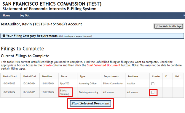 In the Create column, select the checkbox in the Ethics Training row, then click the Start Selected Document button.