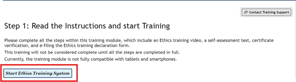 Read the Instructions on this page and click the Start Ethics Training System button.
