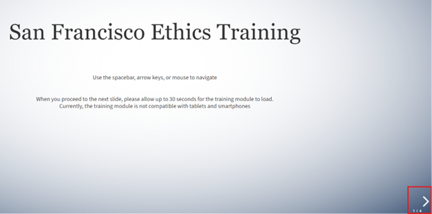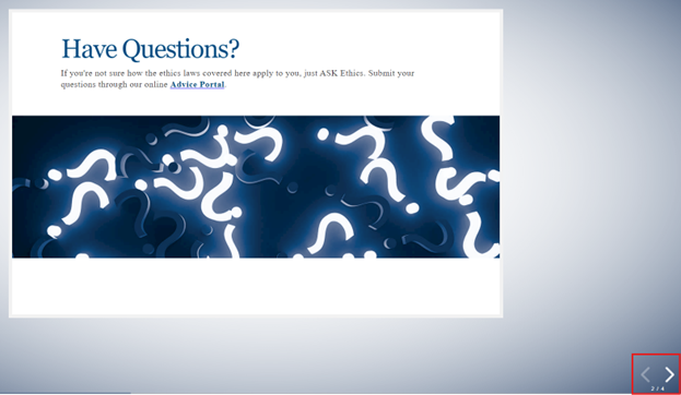 Upon completion of the Annual Ethics Training module, click the Right Arrow Key in the bottom right corner of the page to continue.